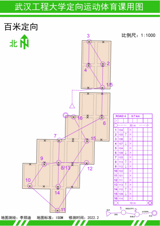 百米定向的比例尺一般选用1:1000,直线距离总长度一般不超过一公里,赛事节奏快,对读图要求较高。一般在开阔、易跑、通视度较好的场地进行,易于观赛。