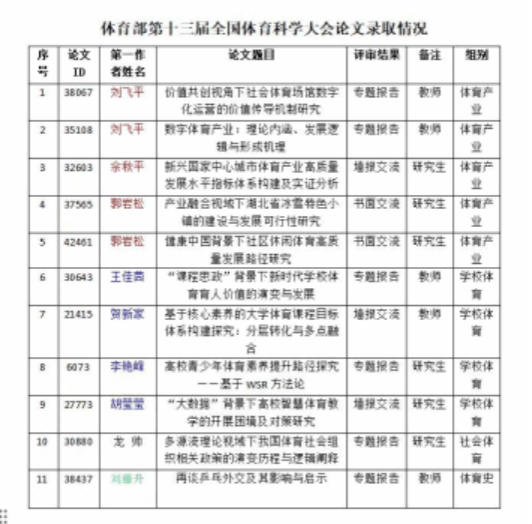 本次会议收到论文投稿达26698篇,mksport体育师生共有11篇论文被录用。教师刘飞平在体育产业分会“体育产业与数字化转型研究”和“体育场馆运营改革研究”专题会场分别作口头报告,王佳茵在学校体育分会专题会场“新时代体育教师队伍建设研究”作口头报告,刘藤升在体育史分会专题会场“体育对外交流史”专题作专题报告,李艳峰在学校体育分会专题会场“学校体育促进青少年体育素养提升的案例研究”作专题报告,龙帅在社会体育分会专题会场“体育社会组织发展的相关问题研究”作专题报告;贺新家、胡莹莹、佘秋平分别在学校体育和体育产业分会场进行了墙报交流;郭岩松论文录用为体育产业分会场书面交流。