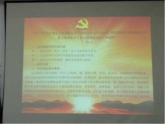 全体会员集中研习了《中共中央关于坚持和完善中国特色社会主义制度、推进国家治理体系和治理能力现代化若干重大问题的决定》、习近平总书记《关于<中共中央关于坚持和完善中国特色社会主义制度 推进国家治理体系和治理能力现代化若干重大问题的决定>的说明》。mksport体育,mk·体育官方网站书记张春义结合自身学习,从坚持和完善中国特色社会主义制度、推进国家治理体系和治理能力现代化的重大意义和总体要求、坚持和完善党的领导制度体系、人民当家作主制度体系、法治体系、 行政体制、基本经济制度、先进文化的制度、民生保障制度、社会治理制度、生态文明制度体系、党对人民军队的绝对领导制度、“一国两制”制度体系、独立自主的和平外交政策、国家监督体系、加强党对坚持和完善中国特色社会主义制度、推进国家治理体系和治理能力现代化的领导等十五个方面进行了解读。