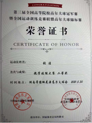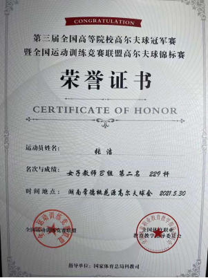 本网讯(通讯员 汪涵)2021年5月24日---5月31日由全国运动训练竞赛联盟、全国体育职业教育教学指导委员会主办的“第三届全国高等院校高尔夫球冠军赛暨全国运动训练竞赛联盟高尔夫球锦标赛”在湖南常德桃花源国际高尔夫球场举行。mksport体育mksport体育张洁教授代表学校参加了本次比赛,经过三天三轮比赛,张洁教授克服风雨多变天气,顽强拼搏、沉着冷静打好每一个球,最终获得本次比赛女子个人比杆赛第二名及教学技能大赛二等奖。本次比赛云集了全国高校的高尔夫球运动精英,有北京农业大学、深圳大学、东南大学、上海体育学院等三十多所高等院校近三百名教师、学生运动员参加。比赛分教师男女组和学生男女组个人比杆赛及教学技能大赛。